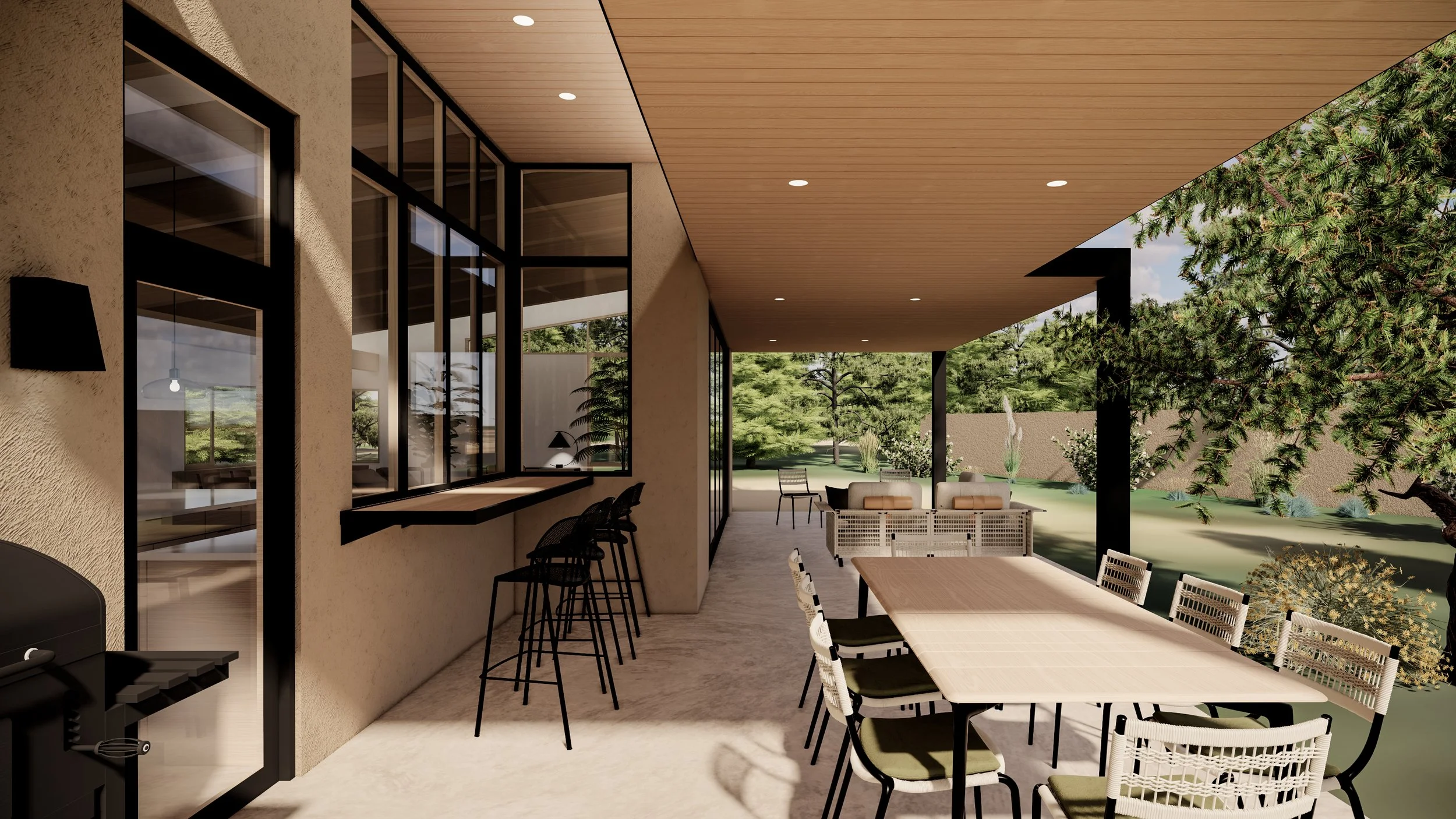 View of the outdoor patio area, with bar pass-through windows and sliding door access to the living room